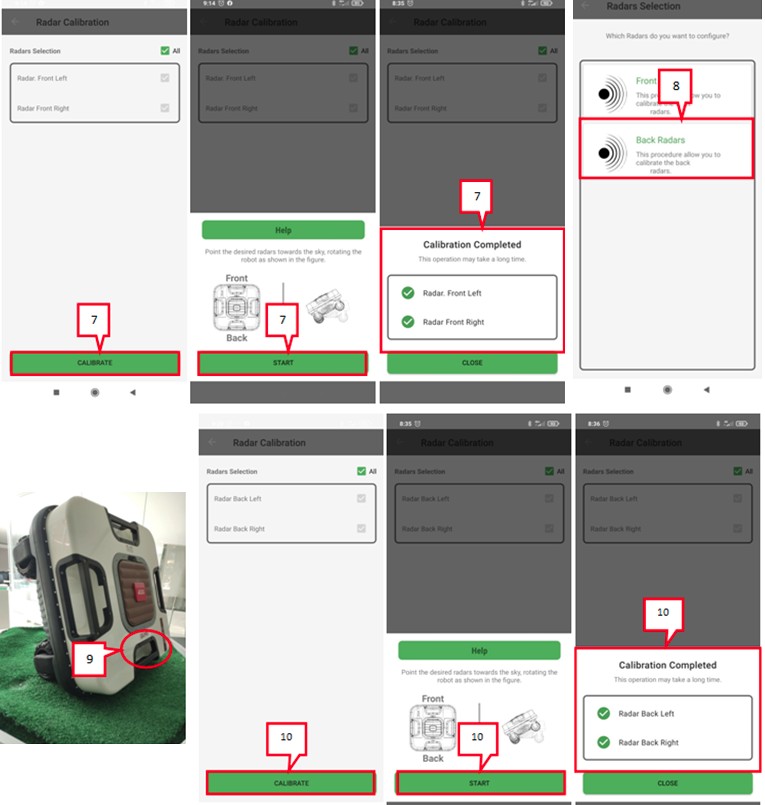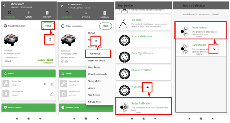 2. Lassen Sie die Radarsensoren von einem Service Partner mit der Service App Kalibrieren. Die Kalibrierung kann helfen Veränderungen durch den Einsatz des Mähroboters Rechnung zu tragen und die Reaktion des Radars auf den aktuellsten Stand zu bringen.