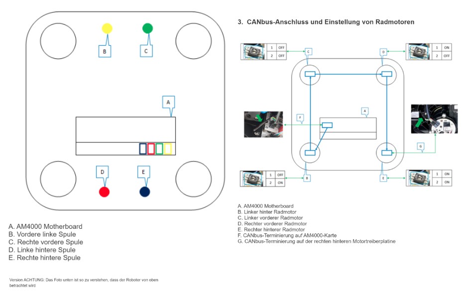 Die nachfolgenden Bilder zeigen die Belegung der verschiedenen Anschlüsse am AM4000 Mainboard des Next TECH Q sowie die CAN Bus Verkabelung der Antriebsmotoren und der Hindernis Radarsensoren.